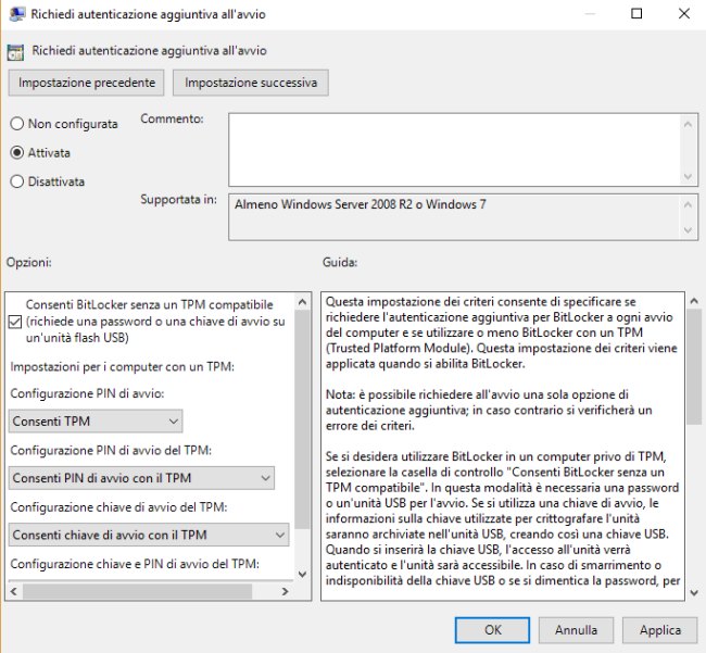 Cliccando su Richiedi autenticazione aggiuntiva all’avvio nel pannello di destra, si dovrà selezionare l’opzione Attivata assicurandosi che la casella Consenti BitLocker senza un TPM compatibile sia a sua volta spuntata.