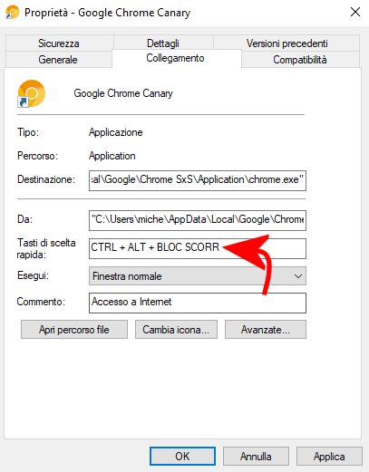 Cliccando sul campo Tasti di scelta rapida quindi premendo CTRL+ALT+Bloc Scorr è possibile fare in modo che l’applicazione selezionata possa essere avviata rapidamente usando tale combinazione di tasti.