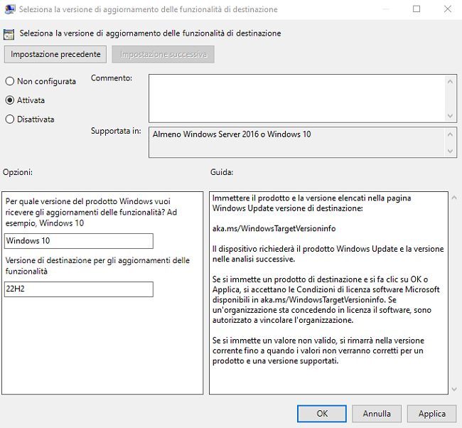 Impostando il primo su Windows 10 e il secondo, ad esempio, su 22H2, Microsoft non esorterà più ad aggiornare il sistema a Windows 11.