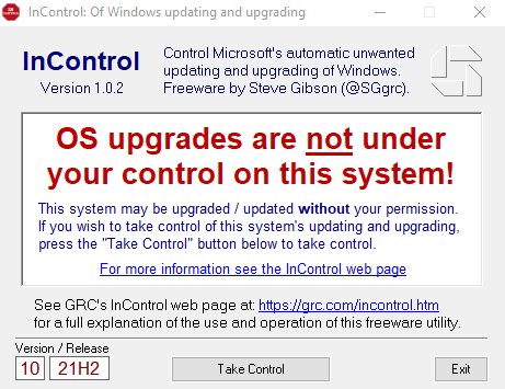 InControl utilizza le stesse chiavi e gli stessi valori del registro di sistema presentati in precedenza per bloccare l’aggiornamento a Windows 11 ed evitare la comparsa dei messaggi Microsoft. Sui sistemi che già si servono delle modifiche di registro corrette, InControl all’avvio mostra subito il messaggio “YOU are in control of OS upgrades on this system“.