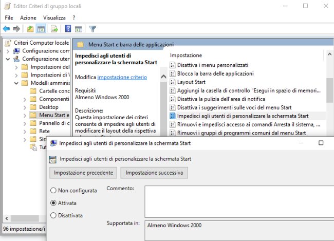 Nel pannello di destra si dovrà individuare la voce Impedisci agli utenti di personalizzare la schermata Start.