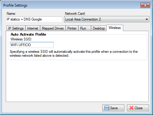 Molto interesante la scheda Wireless: nel caso in cui l’interfaccia di rete a cui si riferisce il profilo in fase di allestimento sia una scheda Wi-Fi, è possibile digitare un SSID. Non appena il programma rileverà tale identificativo, provvederà ad impostare automaticamente il profilo di configurazione.