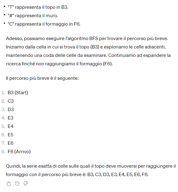 Apparentemente ChatGPT comprende il quesito e visualizza il problema anche in maniera grafica. Quando si giunge alla soluzione proposta, tuttavia, ci si accorge che è sbagliata perché ChatGPT fa schiantare il topo contro il muro in E4.