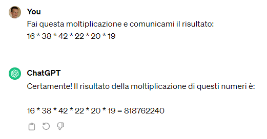 È facile verificare come ChatGPT si trovi in difficoltà anche nell’esecuzione di calcoli matematici e operazioni aritmetiche, spesso molto semplici. Provate con una semplice moltiplicazione:
