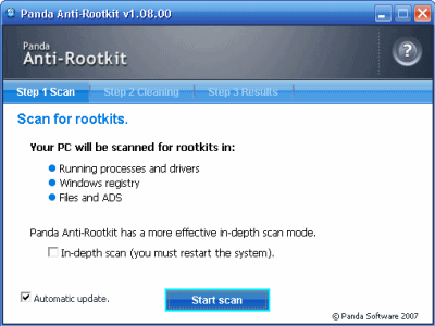 Se la casella Automatic updates verrà lasciata attivata, Panda Anti-Rootkit provvederà eventualmente a scaricare dal sito ufficiale la versione più aggiornata del prodotto. Attivando una scansione approfondita (In depth scan), il sistema sarà riavviato in modo da effettuare una scansione immediatamente prima che possano essere eseguiti eventuali componenti dannosi. Nel caso in cui uno o più rootkit dovessero essere rilevati, Panda Anti-Rootkit ne visualizzerà l’elenco completo (The following rootkits have been detected) e ne permetterà la rimozione. Per completare la pulizia del sistema sarà necessario riavviare Windows.
