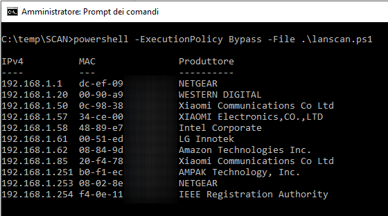 Lo script PowerShell contenuto in questo archivio compresso, invece, consente di mettere in corrispondenza diretta gli indirizzi IP attualmente usati all’interno della LAN con gli indirizzi MAC e il produttore di ciascuna scheda di rete.