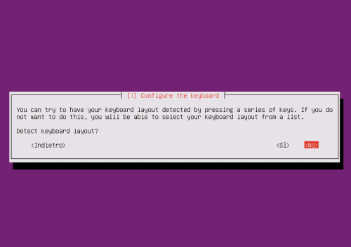 La procedura d’installazione di Ubuntu Server è esattamente quella illustrata in questo nostro articolo. Dopo aver lasciato inserito il CD d’installazione di Ubuntu Server nel lettore e riavviato il personal computer, si dovrà avviare il setup indicando, dapprima, la lingua prescelta (l’italiano) quindi la tastiera che si possiede. Se si utilizza una tastiera dal layout italiano, suggeriamo di rispondere No alla domanda “Detect keyboard layout” e selezionare sempre la voce Italia dalle due schermate seguenti: