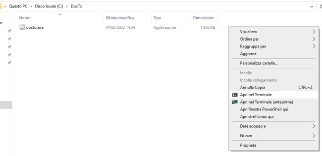 Dalla pagina indicata in precedenza, non si deve fare altro che scaricare il file docto.exe e salvarlo in locale in una cartella di propria scelta (ad esempio C:\DocTo).