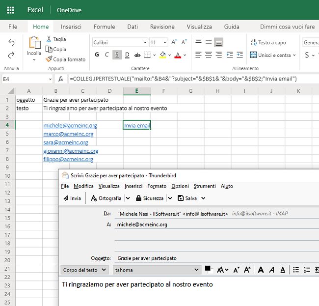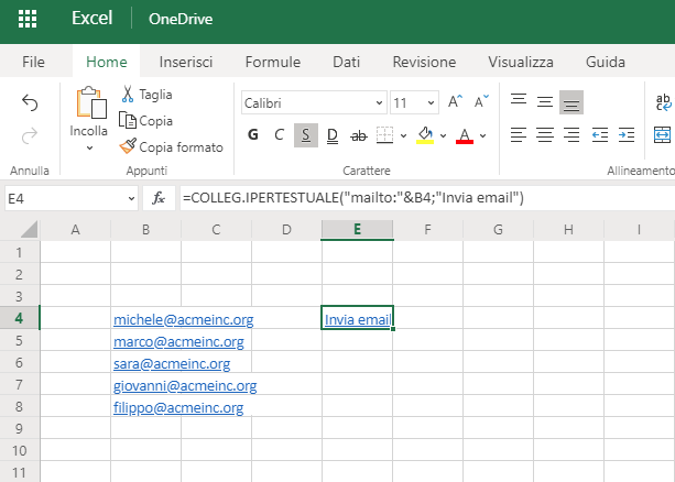 Digitando =COLLEG.IPERTESTUALE in una delle colonne limitrofe di destra, si può sfruttare la funzione Excel che permette di creare un link cliccabile per fare in modo che il software Microsoft componga automaticamente una email.