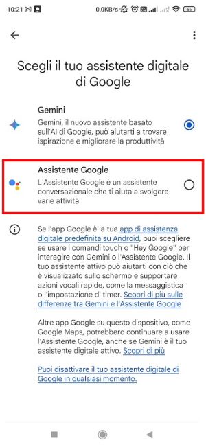 Per disattivare l’assistente vocale Android, è necessario selezionare Assistente Google nella schermata Scegli il tuo assistente digitale. Se si fosse precedentemente optato per l’uso di Gemini, quindi, bisogna prima tornare alla selezione Assistente Google.