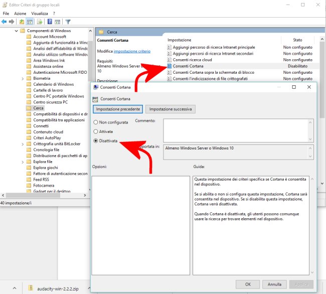 Per procedere e disabilitare Cortana, basta premere la combinazione di tasti Windows+R, scrivere gpedit.msc quindi cliccare su Criteri Computer locale, Configurazione computer, Modelli amministrativi, Componenti di Windows, Cerca, fare doppio clic sulla regola Consenti Cortana quindi scegliere l’opzione Disattivata.