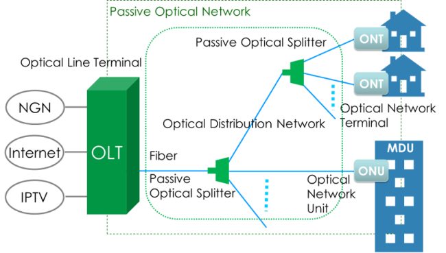 Lato operatore l’apparato elettronico che funge da interfaccia si chiama Optical Line Termination (OLT) mentre sul versante dell’utente prende il nome di Optical Network Termination (ONT). Le risorse ottiche disponibili sull'”albero” vengono a valle condivise tra gli utenti abbonati al servizio.