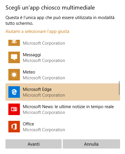 5) Nella schermata seguente, Windows 10 chiederà quale applicazione dovrà essere utilizzabile dall’utente. Essa sarà l’unica che verrà eseguita automaticamente e caricata a tutto schermo. Tra le varie possibilità si può selezionare anche il browser Microsoft Edge e impostare un sito web predefinito che sarà caricato come pagina iniziale.