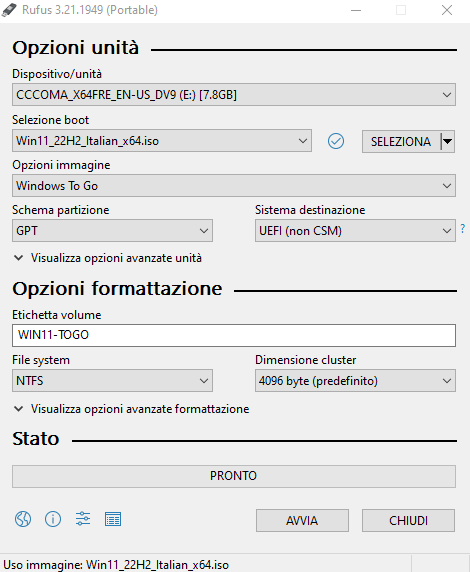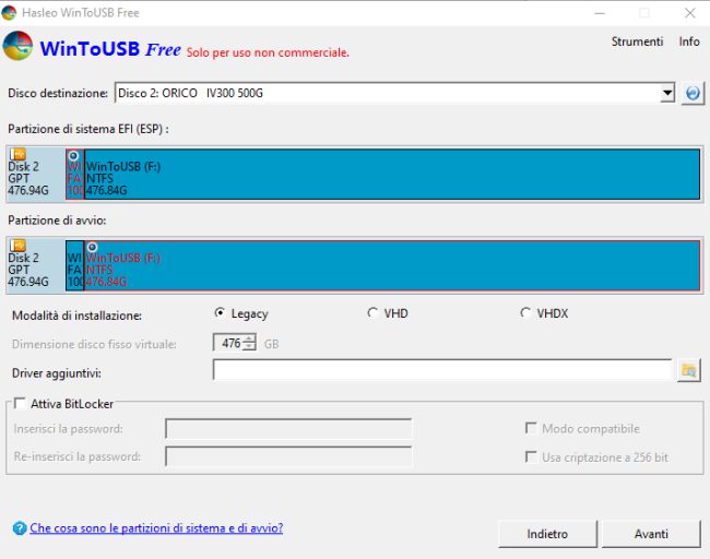 Come alternativa a Rufus si può scaricare il software WinToUSB e installarlo su un sistema Windows perfettamente funzionante.