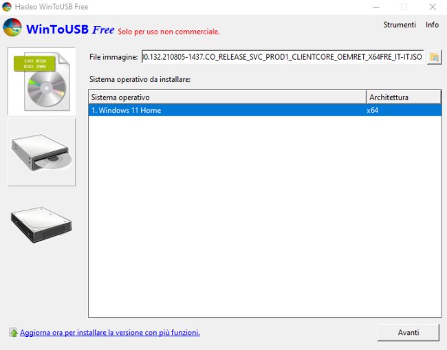 Se si volesse installare su USB Windows 11 Pro o altre edizioni del sistema operativo diverse dalla Home si potrà successivamente valutare l’acquisto di una licenza di WinToUSB.