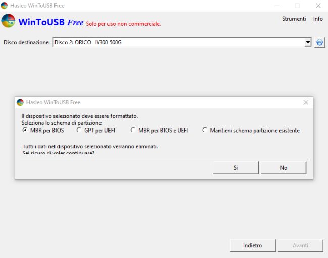 Nella schermata successiva si può lasciare tutto così com’è tenendo presente che WinToUSB elimina automaticamente tutto l’eventuale contenuto della chiavetta USB.