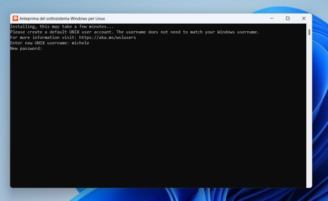 Dopo il riavvio di Windows, WSL conclude l’inizializzazione della macchina Linux chiedendo di specificare nome utente e password per l’account root. Come avviene in qualunque finestra del terminale Linux, la digitazione della password non porta alla comparsa di alcun carattere a video: ciò è del tutto normale. La password va inserita per conferma una seconda volta.