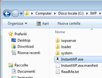 Dopo aver scaricato ed installato Instant WordPress in una cartella di propria scelta, per avviare il server web sarà sufficiente fare doppio clic sull’eseguibile InstantWP.exe.