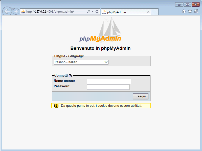 Cliccando su MySQL Admin verrà visualizzato il pannello di amministrazione dell’applicazione web PhpMyAdmin che, com’è noto, consente di gestire i database MySQL.