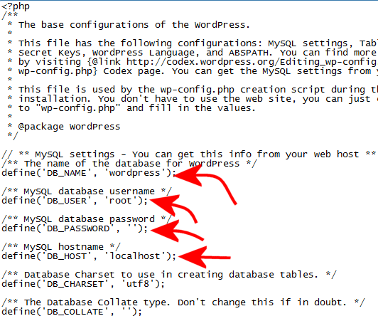 Ultimato l’upload di tutti i file di WordPress, bisognerà aprire il file wp-config.php sul server remoto ed impostare le credenziali d’accesso corrette per l’utilizzo del database MySQL. In particolare, bisognerà sistemare le direttive evidenziate in figura con una freccia rossa.
