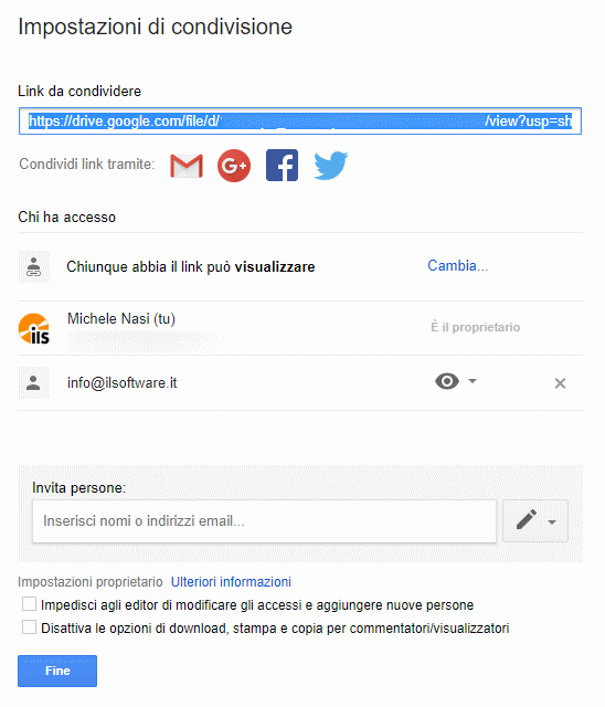 Selezionando l’opzione Attiva la condivisione tramite link, chiunque abbia il link può visualizzare, il destinatario dell’email non dovrà necessariamente disporre di un account utente Google: egli potrà effettuare senza problemi il download del file condiviso.