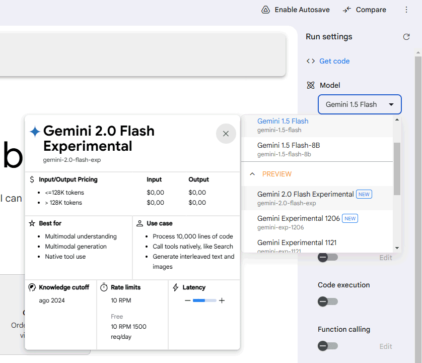 Prima di mettere mano al codice di programmazione, suggeriamo di aprire Google AI Studio quindi scegliere Gemini 2.0 Flash Experimental dalla colonna a destra (Model).