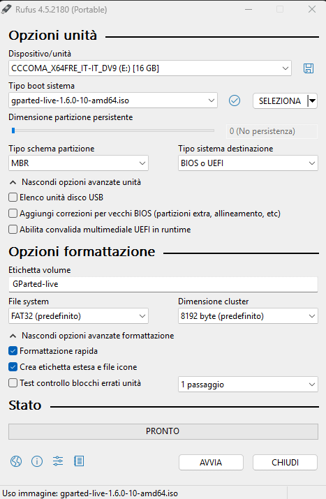 Con un clic sul pulsante SELEZIONA, scegliete il file ISO precedentemente prelevato dal sito di GParted quindi assicuratevi che nel menu a tendina Dispositivo/unità siano riportati il nome e la lettera identificativa di unità della chiavetta USB collegata al sistema sulla quale si andrà a salvare i file di GParted.