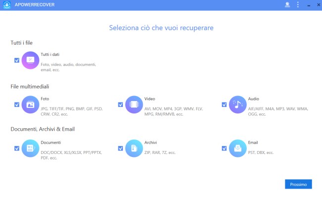 L’utente ha la possibilità di restringere la ricerca dei dati persi a una specifica tipologia di file oppure scegliere Tutti i dati per effettuare una scansione omnicomprensiva.