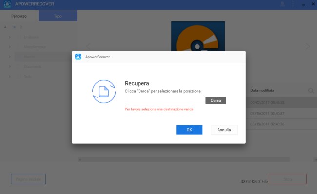 Servendosi del pulsante Cerca si dovrà indicare il percorso in cui i file selezionati debbono essere ripristinati. Suggeriamo di indicare un’unità diversa rispetto a quella che contiene gli elementi che ApowerRecover deve recuperare.