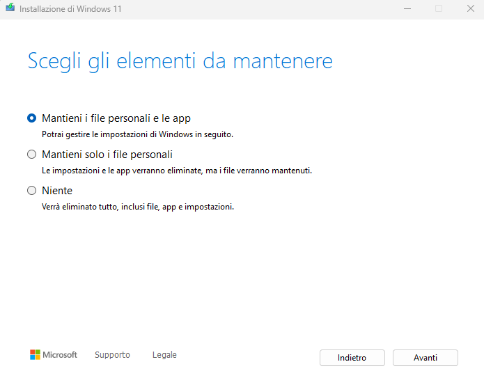 Scegliendo l’opzione Mantieni i file personali e le app, si effettua un aggiornamento in-place: si provvede a reinstallare Windows 11 senza la rimozione di impostazioni, programmi e file degli utenti.
