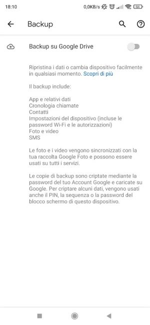 5) Configurare il backup dei dati. Toccando la voce Google nelle impostazioni di Android quindi Backup è eventualmente possibile attivare il backup automatico su Drive delle app e dei relativi dati, della cronologia delle chiamate, dei contatti, delle impostazioni del dispositivo, delle foto e dei video, degli SMS.