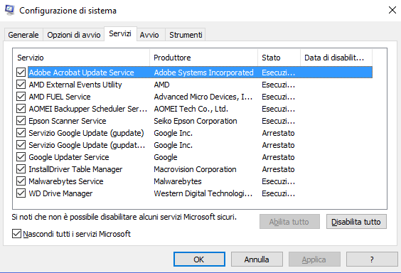 Il suggerimento è quello di attivare la casella Nascondi tutti i servizi Microsoft per stabilire quali servizi di terze parti sono stati installati sul sistema.