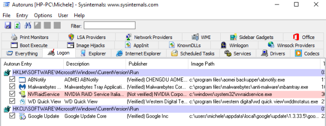 Dopo aver avviato Autoruns, suggeriamo di cliccare sulla scheda Logon: qui si troveranno gli stessi elementi rappresentati dal Task Manager e dall’utilità MSCONFIG nella scheda Avvio.