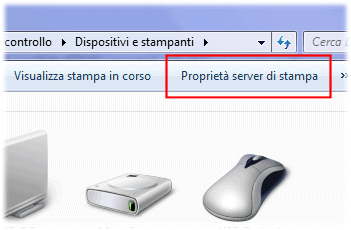 Nel caso in cui si avesse la necessità di rimuovere completamente il driver associato ad una o più stampanti, sia locali che di rete, sarà sufficiente cliccare sull’icona corrispondente al dispositivo d’interesse quindi premere il pulsante “Proprietà server di stampa” della barra degli strumenti.