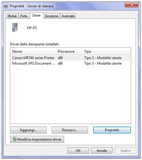 Come abbiamo già evidenziato, infatti, rimuovendo una stampante dalla finestra Dispositivi e stampanti di Windows 7 i driver della stessa continuano a restare installati sul personal computer. La finestra Proprietà server di stampa consente anche di aggiungere nuovi driver per la stampante selezionata in modo tale da sostituire quelli già presenti. Talvolta, infatti, può accadere di aver acquisito, sul sistema Windows 7, driver di periferica concepiti per Windows XP da un sistema, collegato in rete locale, che condivide la stampante. La scheda Driver della finestra Proprietà server di stampa, in Windows 7, consente di levarsi d’impaccio.
