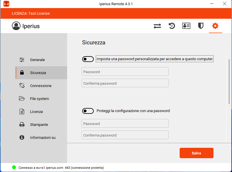 Se si prevedesse di lasciare sempre attivo come servizio di sistema il software di controllo remoto Iperius Remote, è sconsigliabile proteggere la macchina con una semplice password formata da quattro cifre: il programma, accedendo alle impostazioni, permette di definire una password alfanumerica lunga e complessa.