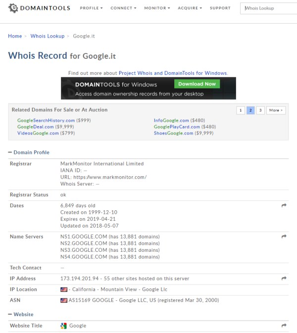 Dopo qualche istante di attesa, si ottengono tutti i dati del nome di dominio specificato. Senza la necessità di interfacciarsi con alcuna applicazione Web.