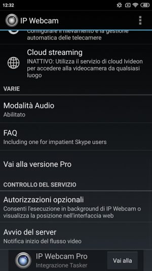 Con le impostazioni di default, basta scorrere interamente la schermata principale di IP Webcam e selezionare Avvio del server.