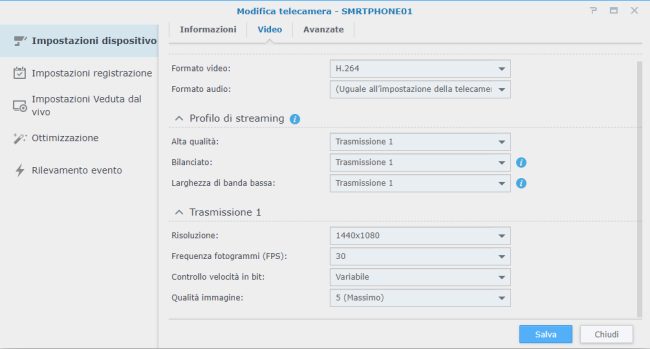 Personalizzando le impostazioni della fotocamera dello smartphone connessa al NAS mediante IP Webcam e ONVIF, sarà possibile migliorare la qualità delle riprese (aumentare qualità e frequenza fotogrammi.