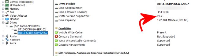 Dopo la scansione iniziale con HWInfo, basta fare clic su Drives, selezionare un’unità a stato solido quindi controllare ciò che appare nel pannello di destra accanto alla voce NVMe Version Supported (qui le specifiche delle varie versioni).