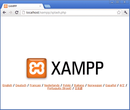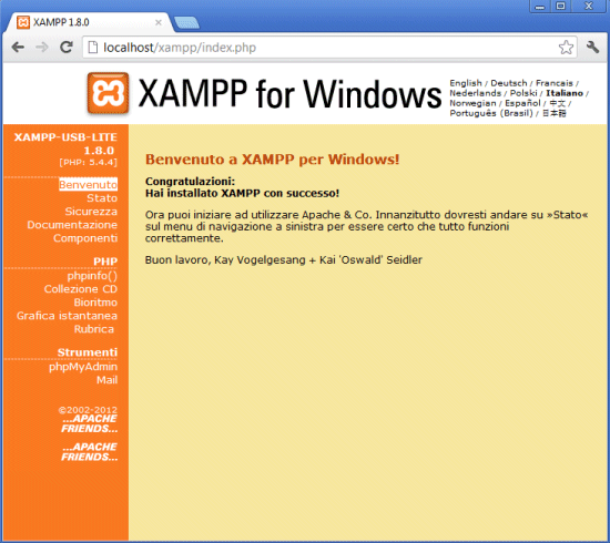 Aprendo il browser web preferito, sia esso Internet Explorer, Firefox, Chrome, Opera o Safari, e digitando nella barra degli indirizzi l’URL localhost, ci si dovrà dinanzi alla schermate seguente: