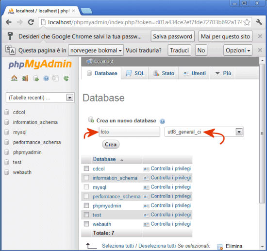 Con un clic su Database quindi digitando foto in corrispondenza di Crea un nuovo database e selezionando utf8_general_ci come set di caratteri per la base dati, si potrà preparare il database che accoglierà l’archivio di ZenPhoto.