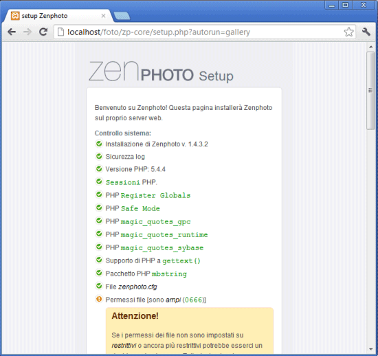 Visitando la pagina http://localhost/foto si avvierà la procedura di configurazione di ZenPhoto: