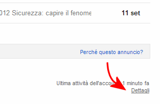 Per accedere al controllo degli indirizzi IP dei sistemi client, è sufficiente effettuare il login al servizio Gmail, scorrere la pagina della posta in arrivo sino in fondo quindi fare clic sul link Dettagli posto sotto l’indicazione “Ultima attività dell’account“: