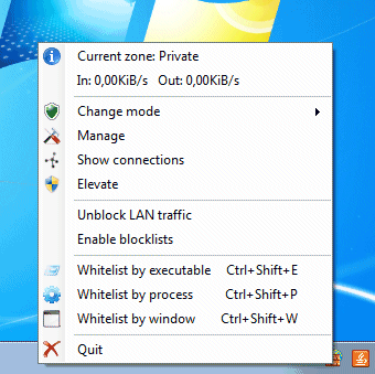 Ad installazione ultimata, TinyWall presenterà una piccola icona nell’area della traybar di Windows 7: cliccandovi si accederà ad un menù contenente una serie di impostazioni semplificate per il firewall di Windows 7 insieme con alcuni strumenti aggiuntivi.