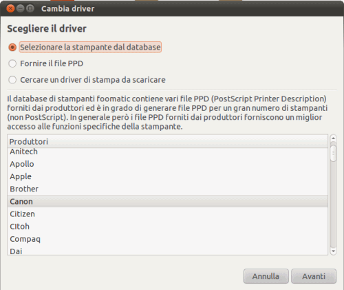Dopo aver scelto, dalla colonna di destra, il driver Canon MP240 series Ver.3.00, la stampante dovrebbe essere configurata e pronta per essere utilizzata da qualunque applicazione Linux.