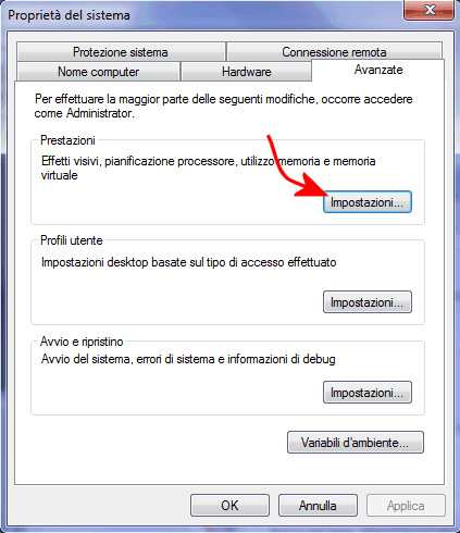 Per procedere bisogna digitare Sistema nella casella Cerca programmi e file di Windows, fare clic sul link Impostazioni di sistema avanzate, sulla scheda Avanzate quindi su Impostazioni, in corrispondenza del riquadro Prestazioni: