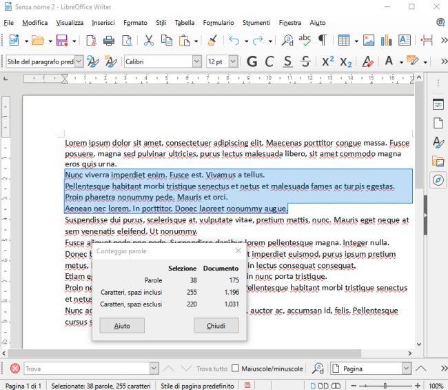 Nel caso di LibreOffice Writer si può variare la selezione mentre la finestra Conteggio parole è visualizzata per verificare come cambia il numero di caratteri. Inoltre è possibile mantenere aperta la finestra Conteggio parole e modificare il documento: i dati vengono aggiornati dinamicamente.