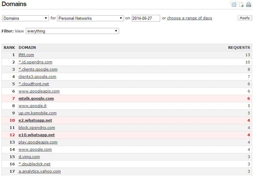 Facendo clic sulla scheda Stats di OpenDNS quindi su Domains, si otterrà la lista dei siti visitati dalla rete locale o comunque dai sistemi configurati per usare i server DNS di OpenDNS.