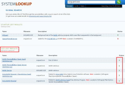 Digitando avguard.exe (file eseguibile desunto dal log di HijackThis) nella casella di ricerca, si otterranno tutte le occorrenze del file all’interno degli archivi di SystemLookup.